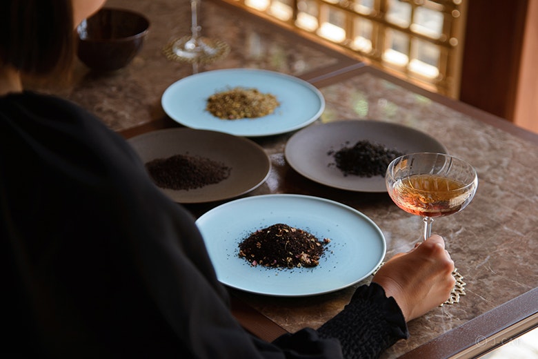 眼前に広がる庭の静けさに癒されながら、ウェルカムドリンクのカクテル(アルコール入りもしくはノンアルコール / ご予約時に選択)を片手に座学がスタート。まずは、Dori’s TEAのラインナップから、季節に合わせた4~5種類の茶葉の魅力に触れます。五感を研ぎ澄ませて、茶葉の形状や香りの違い、またユニークな生産方法について学びを深めるごとに、未知なる紅茶の世界へと没入してゆくようです。