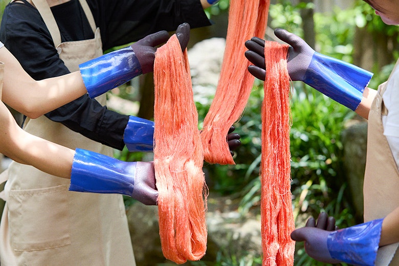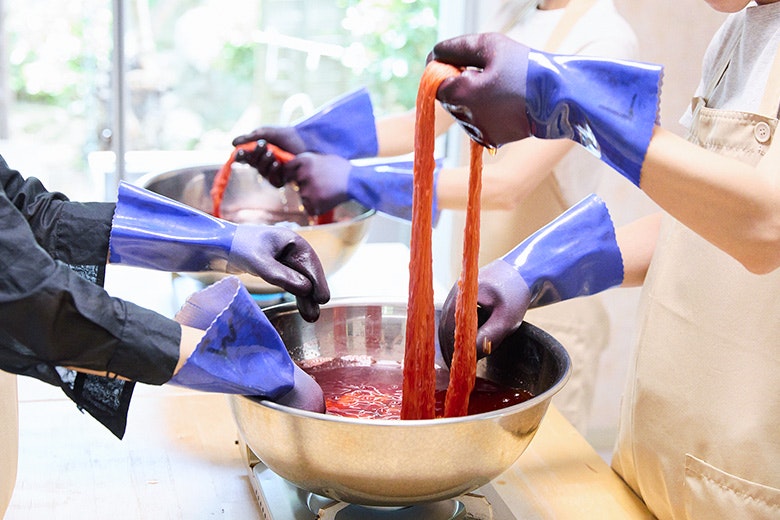 染料に水を入れて火にかけ、ボウルの中で手を動かして糸を泳がせれば、立ち込める香りや感触に形容しがたい心地良さを覚えます。素材となる植物が育った土壌や水、収穫した時期などによって染まる色が変わるのも魅力。ぜひ色との一期一会を楽しんでください。