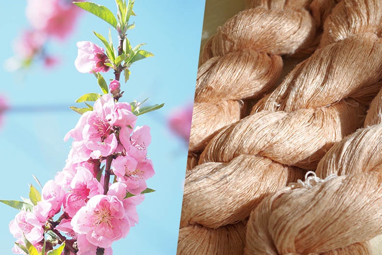 2月は桃を染めます。桃は可愛らしい花と緑の葉で春を告げる植物で、邪気を払う縁起物としても親しまれてきました。蕾のついた枝からは、果実を思わせるような桃色がいただけます。来る春に想いを馳せ、染めのひとときを過ごしましょう。