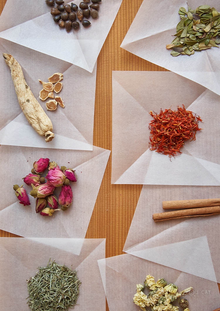 気になる和漢植物を見つけたら、その香りも楽しみましょう。ハーブを思わせるものや、スパイシーなものなど、その表情の豊かさに驚くかもしれません。効能だけに注目するのではなく、香りの調和、お湯を注いだ時に水面でほどける葉や花びらの姿をイメージしながらブレンドするひとときは、想像力まで刺激されます。