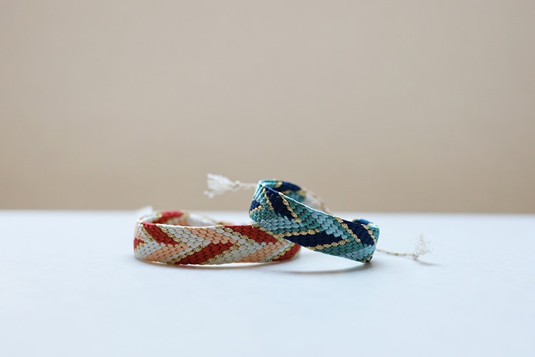 しばらく手を動かしていると余裕が生まれ、無心で糸と向き合う時間が続きます。糸につけた重りがぶつかり合う「カラン、コロン」という音がにぎやかになったら、リズミカルに手が動き始めた証拠。ブレスレットに必要な長さに組み上げれば出来上がりです。職人の手で仕上げを行い、完成後2ヶ月ほどで郵送にてお手元にお届けします。
