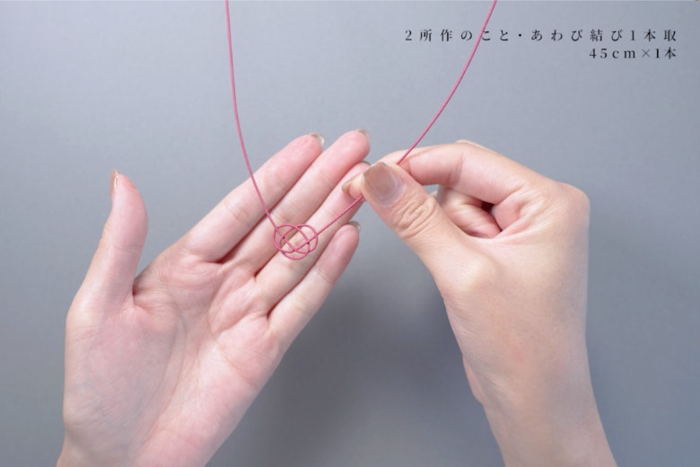 はじめに、水引1本で「あわび結び」を練習します。縁起が良いとされる鮑(あわび)に形が似ていることからその呼び名が付いたそうですが、最近では「あわじ結び」と呼ばれることも多いそう。「水引の素材は紙なので結び直すと跡がついてしまいます。そのため、正しい手順と所作がとても大切なんです」と田中氏。すべての結びの基本となるあわび結びですが、田中氏が丁寧にレクチャーしてくれるため手先に自信がなくても心配ありません。ゆっくり結んでいきましょう。