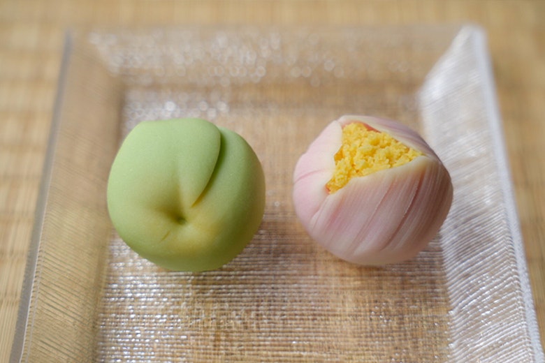 白餡に色素を合わせた練り切り生地を手のひらに乗せると、柔らかな感触が伝わってきます。きれいに丸め直し、板で押して平らに広げたら中餡を包む包餡、そして造形へと進みます。実際に手を動かしてみることで、あらためて職人技のすごさを実感できるでしょう。