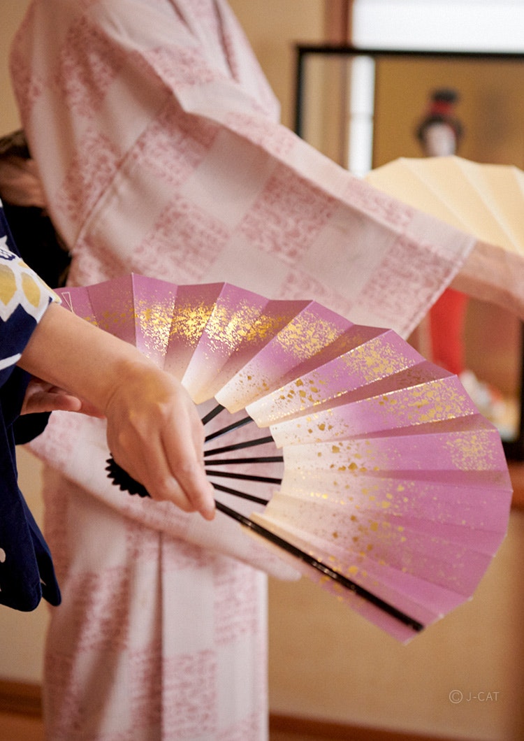 日本舞踊を踊るためには、まず着物をきちんと美しく着こなすことが大切。足袋を履いて帯を締めると、心身ともに引き締まります。お稽古着の貸し出しがありますが、お手持ちの着物を活用する機会にするのも素敵。普段着とは異なる日本の優美な装いに胸が高鳴ります。