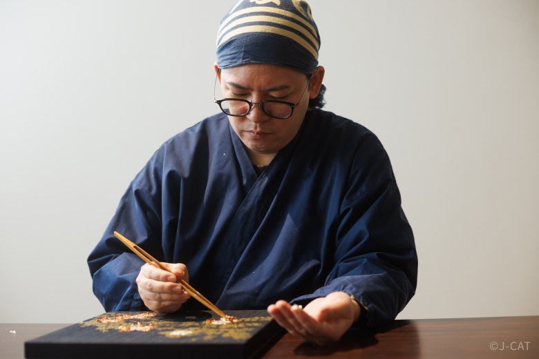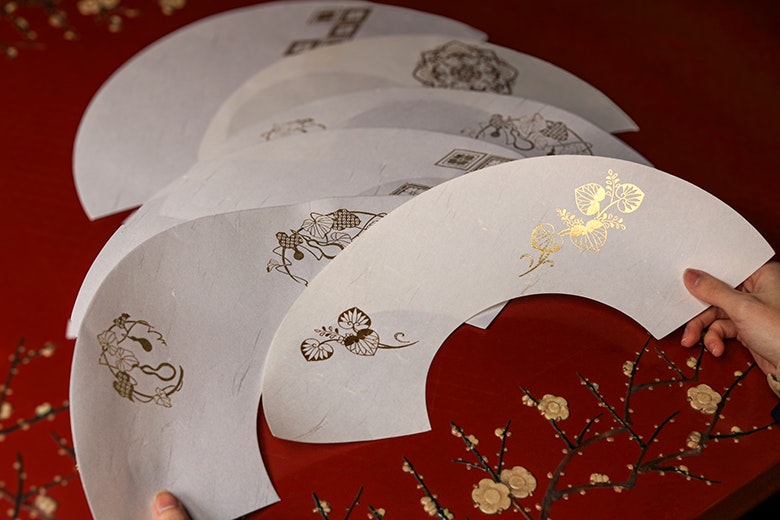 本体験で制作する扇子の紙には、あらかじめ金色の絵が刷られています。店舗では扱っていない、田中金彩工芸の4代目・田中秀人氏が直接金彩を施した逸品です。1927(昭和2)年の創業以来、100年にわたり友禅染に金彩技法を用いて手作業で金箔を施してきた田中金彩工芸。その貴重な手仕事に触れながら、日常を彩る一生ものの扇子を自らの手で完成させましょう。