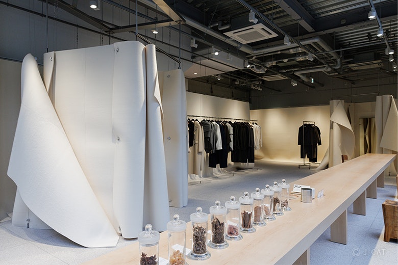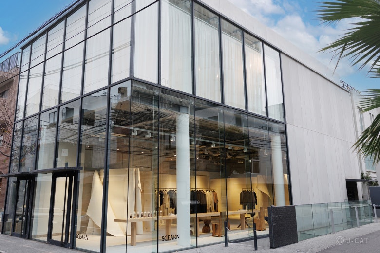 「日本の庭園がもつ、余白の美」からインスピレーションを得たという、ガラス張りの外観と白い壁が印象的なSCEARN AOYAMA。1階には最新コレクションが展示され、2階には日本の文化や伝統を多岐にわたり表現できる「Re Gallery SCEARN」があります。