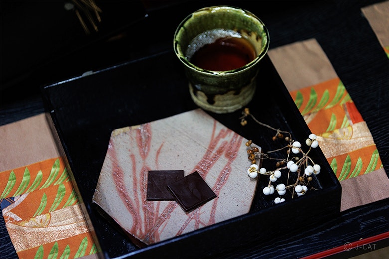 ※11月~2月催行日限定のオプション「薬種チョコレート食べ比べ」を選択された場合は、甘味2種・お抹茶と共に提供します。