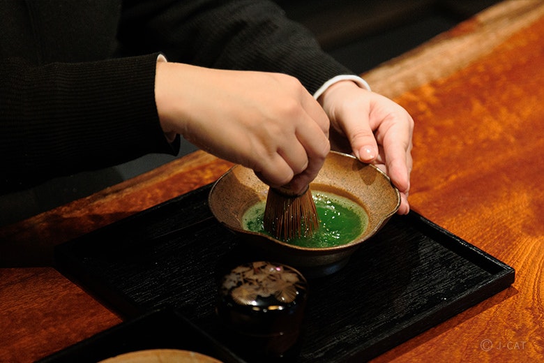 お香づくりの後は、お茶菓子でひと息。住職に教わりながら自ら抹茶を点てます。手首を使ってリズミカルに茶筅を動かすと、きめ細やかな泡が立ち、抹茶の香りがふわりと漂います。