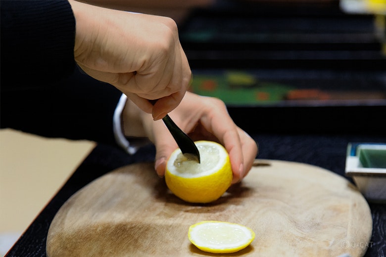 寺院特有の静けさの中にどこか異国の気配を感じるこの場所で、まずは寺院の歴史と弘法大師にまつわる逸話を聞きましょう。お話に耳を傾けながらいただくのは、柚子の果肉と果汁を使ったウェルカムドリンク。柚子の爽やかな香りが、盛松寺が築いた長い歴史の扉へといざないます。