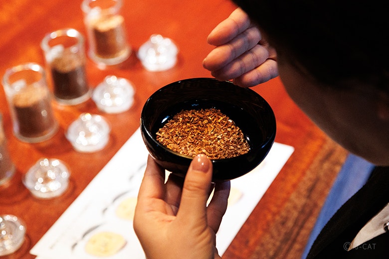 11月~2月には季節限定のオプションとして、特別な薬種チョコレートの食べ比べ体験も。香木の主産地であるインドネシアやベトナムは、古くから薬として珍重されてきたカカオの産地としても知られています。インドネシア産のカカオを使用した薬種チョコレート3種と、ベトナム産のカカオを使った薬種チョコレート3種の計6種を、和紅茶と薬種をブレンドした薬種紅茶と共に食べ比べます。