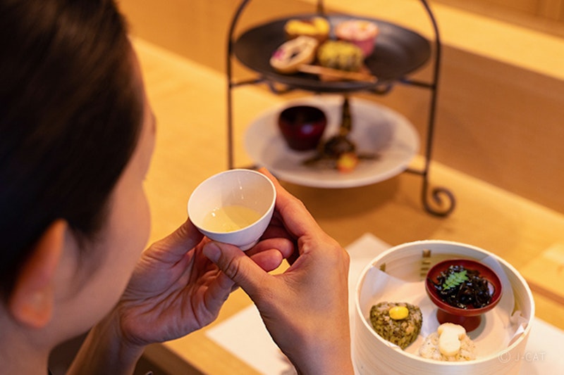 創業から受け継がれてきた佃煮の味わいを、檜のおひつに詰めた料理と2段のティースタンドにあしらった和スイーツで楽しむ本体験。現代の感性でアレンジされた佃煮メニューと合わせるのは、宇治茶の産地として名高い京都府和束町産の煎茶です。