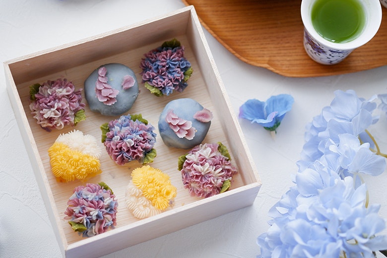 まず、その日制作するお花の特徴や作り方を講師がレクチャーしてくれます。例えば初夏の季節のモチーフは、初心者でも比較的簡単に制作できる紫陽花。あんこを、鮮やかな青い花を咲かせるハーブ、バタフライピーでブルーに、紫芋でパープルに色付けします。2種類のあんこをミックスさせてマーブル状にすることで、花びらの綺麗なグラデーションを表現できます。