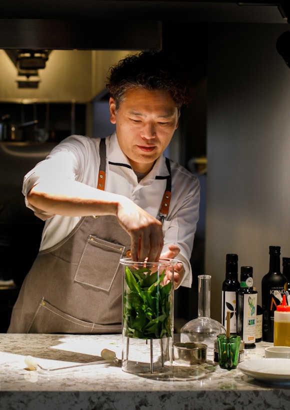 京都・丸太町の路地奥に佇む、町家をリノベーションしたレストラン。フレンチをベースとしながらも枠にとらわれないおまかせコースを、完全予約制で提供。ハーブや草花の香りを中心に、色彩や温度感といったあらゆる“相乗効果”によって生まれる新感覚の料理が評価を得ている。